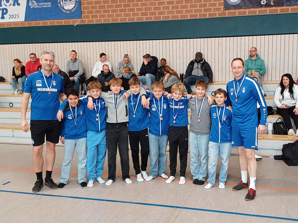 Eine Medaille verpasst hat hingegen unsere D2-Jugend, die als einziges Team mit dem jüngeren Jahrgang angetreten war, am Sonntagabend in Haldensleben. In der Gruppenphase konnte der spätere Turniersieger vom Haldensleber SC noch bezwungen werden, doch in der K.o.-Phase fehlten nach langer Wartezeit dann doch die Körner und ein wenig das Turnierglück. Nach einer Niederlage im Halbfinale ging auch das Spiel um Platz 3 gegen Arminia Magdeburg mit 1:2 verloren.