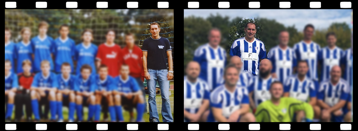 Als erstes Beispiel haben wir für euch im Archiv gekramt. Ihr seht Rico Q. und Daniel W. im Kreise unserer Altherrenmannschaft. Zum Vergleich ein Foto aus gemeinsamen A-Juniorenzeiten aus dem Jahr 1992. Kinder, wie die Zeit vergeht ...