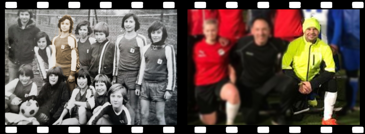Manch einem wäre der Ball schon längst weggekullert. Micha Borst aber hält gekonnt vor 18 Jahren den Ball unter der Sohle und unter Kontrolle. Muss er wohl auch, denn in dieser staubigen Turnhalle möchte kaum einer das Leder in der Ecke suchen müssen. Im Jahr 2019 posiert er auf dem neuen Kunstrasen schmuck in weiß (rechts). Den Sportsfreund links ignorieren wir mal kurz ... es sei denn, er schickt auch noch ein Foto ein.