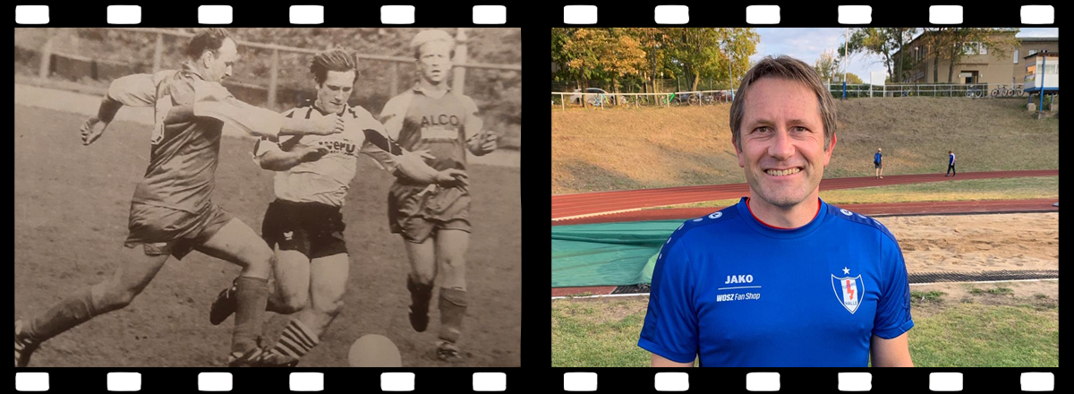 Viel hat sich nicht geändert bei "Uns Uwe" ... außer, dass die Farbfotografie in Mode gekommen ist. Uwe Neuner, langjähriger Nachwuchscoach bei den Felsenkickern und seit jüngerer Zeit Mittelfeldturbo bei den Oldies kann sogar mit einem Zeitungsartikel dienen. In den gelb-schwarzen Farben von Stahl Halsbrücke (für Nichtkenner: bei Freiberg gelegen) pflügte er schon damals durch die Kreisliga.