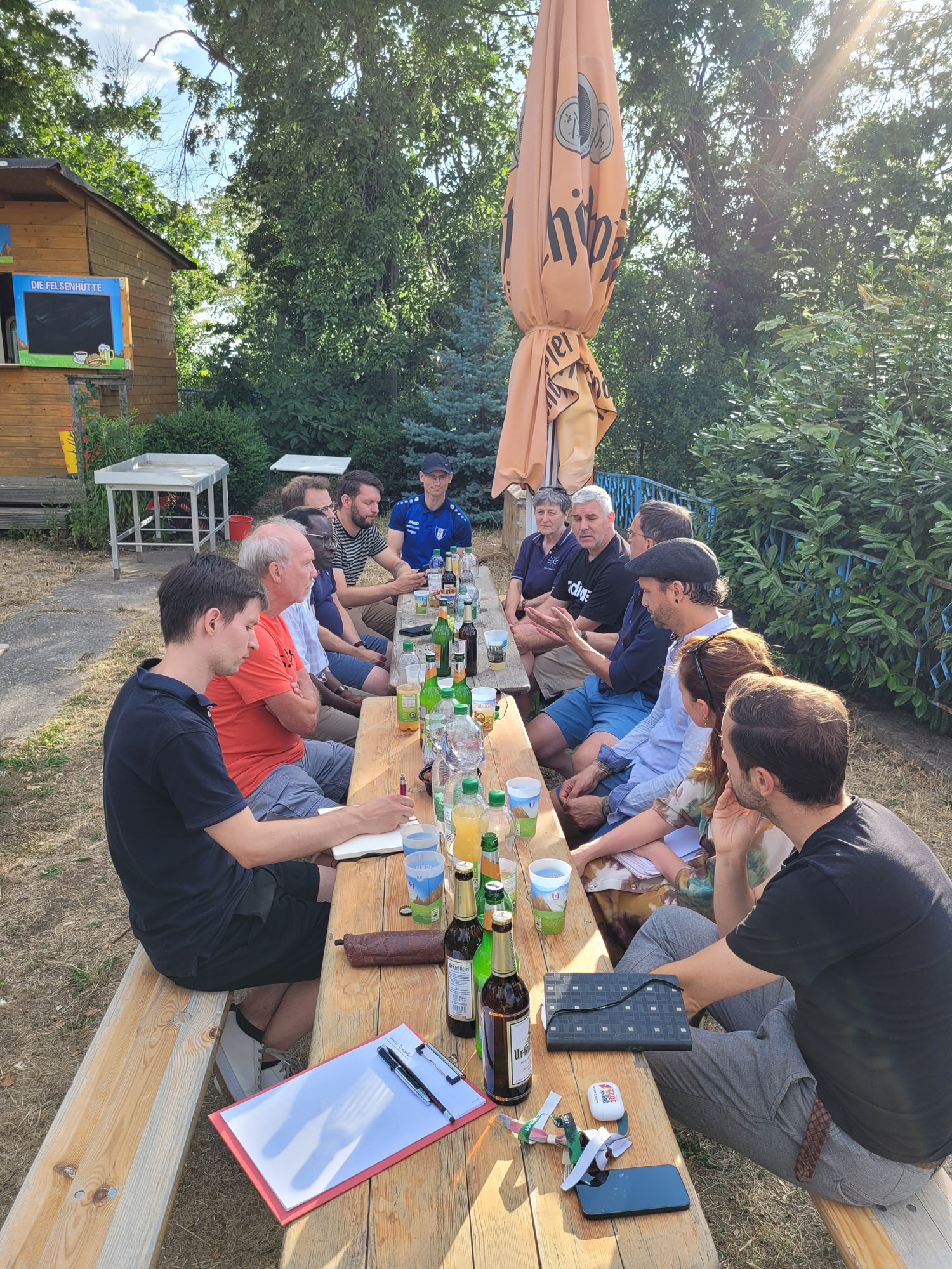 Und natürlich durfte die Schilderung der katastrophalen Bewässerungssituation auf der Sportanlage nicht fehlen, die durch die willkürliche Kappung der Brauchwasserleitung von der Saale zum Sportplatz im Zuge der Sanierung der Riveuferpromenade entstanden ist. Auch wenn mittlerweile eine provisorische Zuleitung errichtet wurde, die nach etlichen vergeblichen Versuchen seit heute auch funktioniert, sind die Schäden auf dem Sportplatz bereits beträchtlich. Die Hilflosigkeit unseres Vereins (trotz massiver Bemühungen) gegenüber dem (Nicht)Handeln verschiedener Bereiche der Stadtverwaltung wurde sehr detailliert geschildert und mit sehr großer Verwunderung durch unsere Gäste aufgenommen. Das Versprechen der Vertreter der SPD-Fraktion, von politischer Seite bei der Verwaltung dranzubleiben und nachzuhaken nehmen wir sehr gerne an.