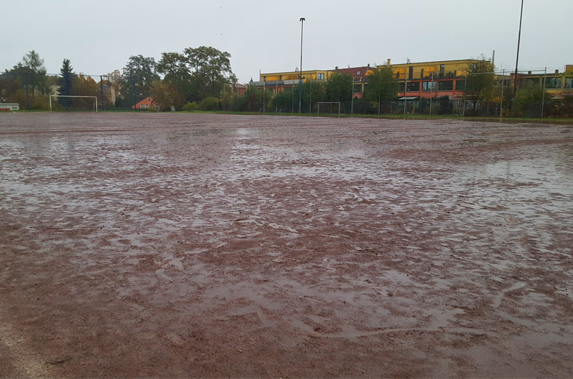 Angesichts des trüben und regnerischen Wetters freut man sich umso mehr, dass unser immernoch fast neuer Kunstrasenplatz durchweg beste Trainings- und Spielbedingungen ermöglicht. Und manchmal hilft ein Blick zurück in die nahe Vergangenheit, um festzustellen, dass es vor gar nicht allzu langer Zeit noch ein wenig anders auf dem Felsen aussah. Vor ziemlich genau drei Jahren reichten 9mm Regen aus, um das Spiel zwischen Turbine III und dem HSC 96 II zum Abbruch zu bringen.