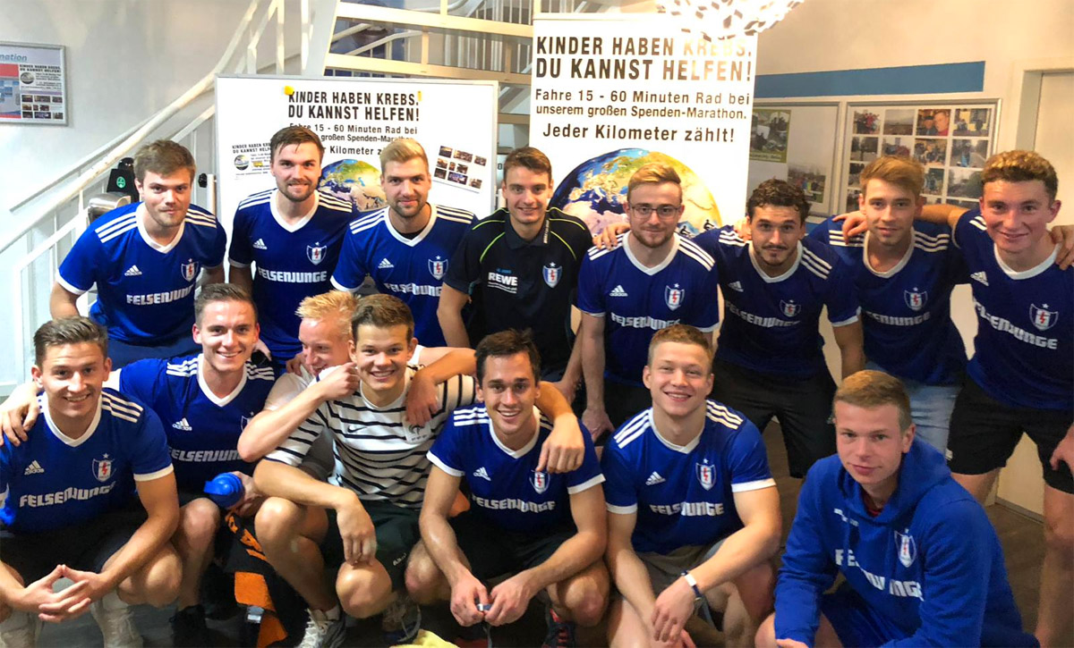 Keine 20 Stunden nach dem 5:0-Sieg gegen die SG Eisdorf waren die Kicker unserer 1.Mannschaft wieder aktiv und beteiligten sich an der Aktion "Gemeinsam einmal um die Welt" zugunsten krebskranker Kinder. Der Sportpark Halle in der Beesener Straße hat zum Spendenmarathon auf dem Fahrrad aufgerufen und 15 Felsenkicker sind dem Aufruf am Sonntag gefolgt. Innerhalb von 60 Minuten strampelten die Turbine-Kicker insgesamt 420 km und erlösten somit 42 € an Spendengeldern.