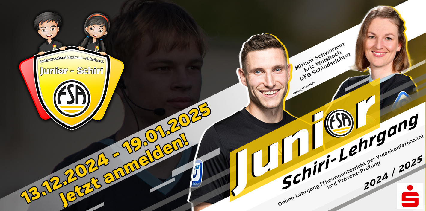 Der Fußballverband Sachsen-Anhalt startet in der Winterpause Sommerpause den 11.Junior-Schiri-Lehrgang für junge Schiedsrichteranwärterinnen und -anwärter. Wer seine Winterpause sinnvoll nutzen und sich zum Schiedrichter ausbilden lassen möchte, ist bei diesem Lehrgang genau richtig. Das Beste: Der Lehrgang ist komplett kostenlos und kann - bis auf die Abschlussprüfung - online durchgeführt werden. Es fallen also nur die Fahrtkosten zur Abschlussprüfung an.