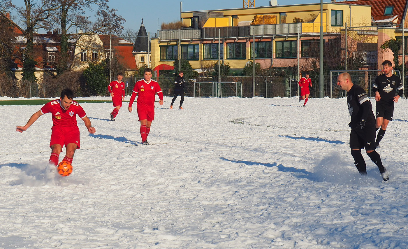 Das erste Testspiel in der Winterpause ging für unser Landesligateam gegen den SSV 90 Landsberg mit 1:2 verloren. Spielerisch hat die Partie aufgrund des Schneegestöbers nur begrenzte Aussagekraft. Es galt eher, auf dem schweren Untegrund "Körner" für die weitere Vorbereitung zu holen. Landsberg stellte sich in der ersten Viertelstunde besser auf die Verhältnisse ein und kam durch Schubert (8.) und Madalschek (10.) zur schnellen 2:0-Führung.