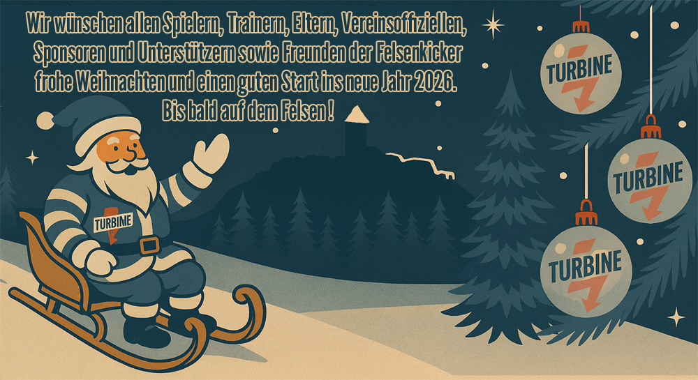 Wir wünschen allen kleinen und großen Felsenkickern, unseren Trainern, Mannschaftsverantwortlichen, den Eltern unserer Kinder, den fleißigen Verantwortlichen im Hintergrund sowie unseren Sponsoren, Unterstützern, Fans und Freunden frohe und besinnliche Weihnachten und einen guten Start ins neue Jahr 2026. Genießt die fußballfreie Zeit mit euren Familien und Freunden. Wir sehen uns im neuen Jahr 2026 auf dem Felsen !