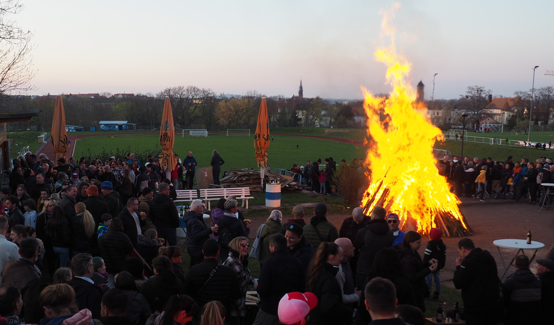 Einmal mehr hatten sich bereits am Samstag zahlreiche 'Fachkräfte' gefunden, um gemeinsam den Stapel für das diesjährige Osterfeuer auf dem Felsen aufzuschichten und das gesamte Drumherum zu organisieren. Was dann allerdings am Sonntagabend an der Felsenhütte los war, übertraf sämtliche (auch planerische) Erwartungen. Bei bestem Osterwetter strömten bereits vor 18 Uhr über 400 Gäste in Scharen bergauf zum Turbine-Sportplatz.